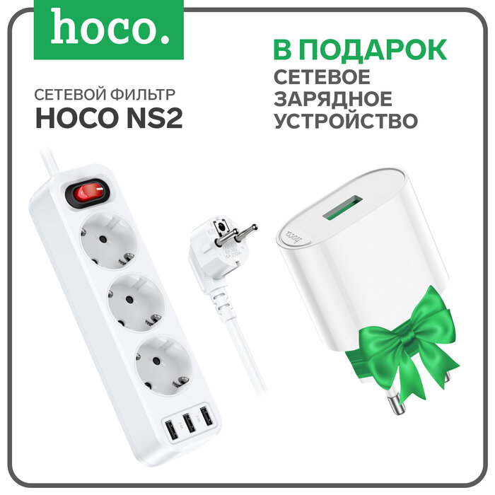 10 цен на Сетевой фильтр HOCO NS2 3 гнезда+3USB 1.8м 4000W белый