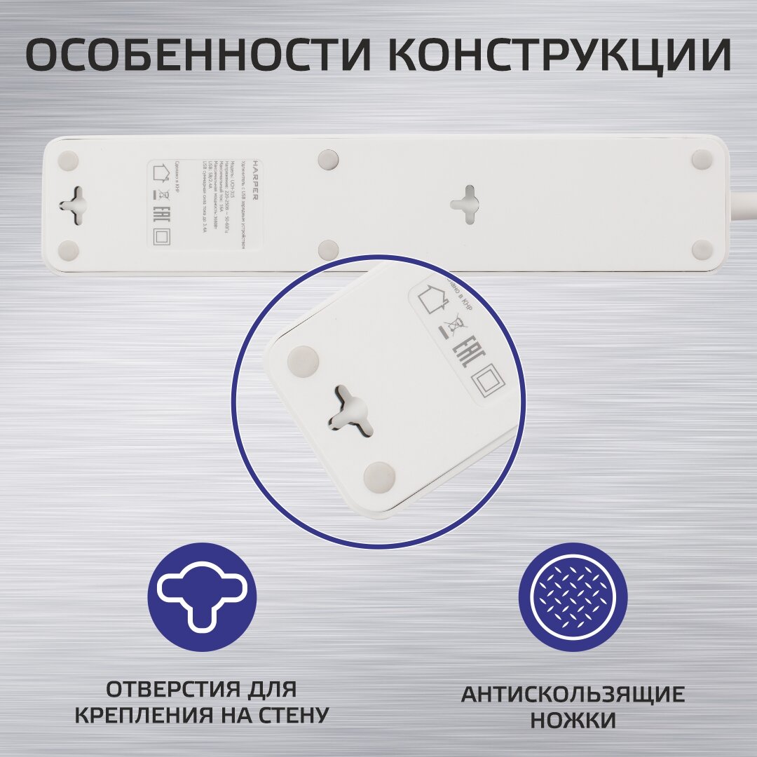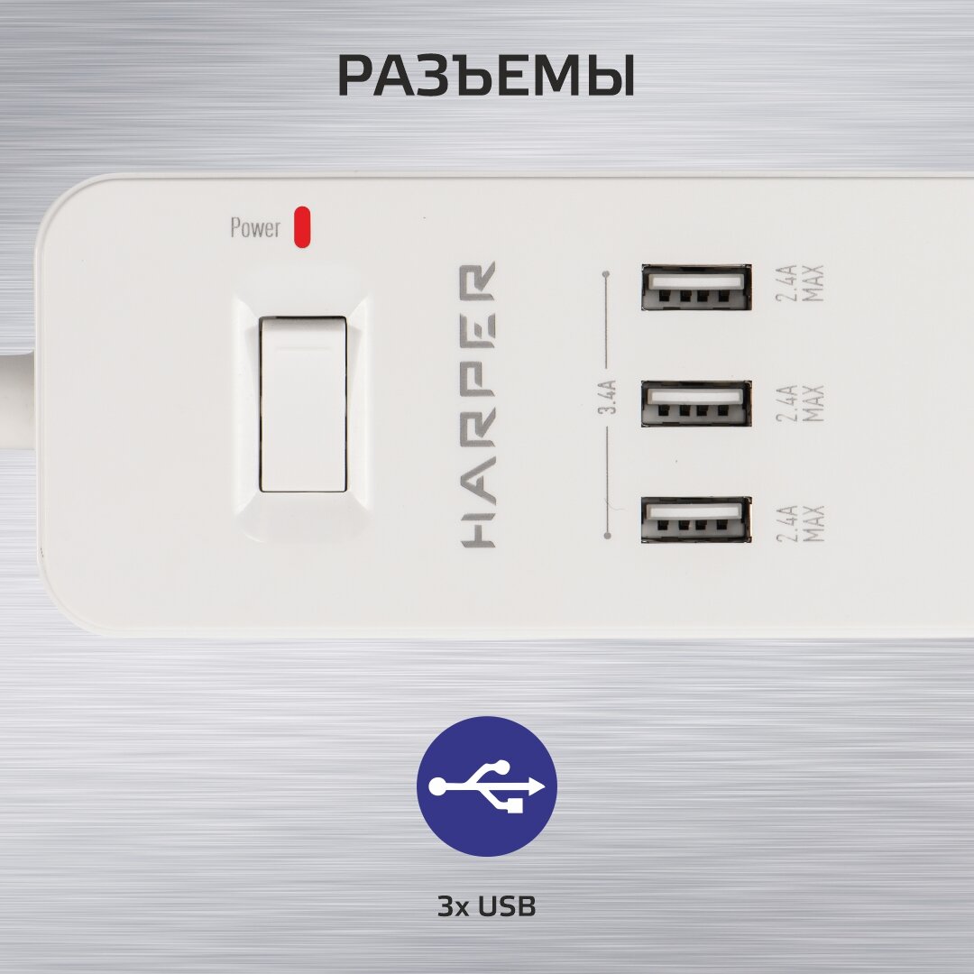 Сетевой фильтр (удлинитель) с USB зарядкой HARPER UCH-325 белый
