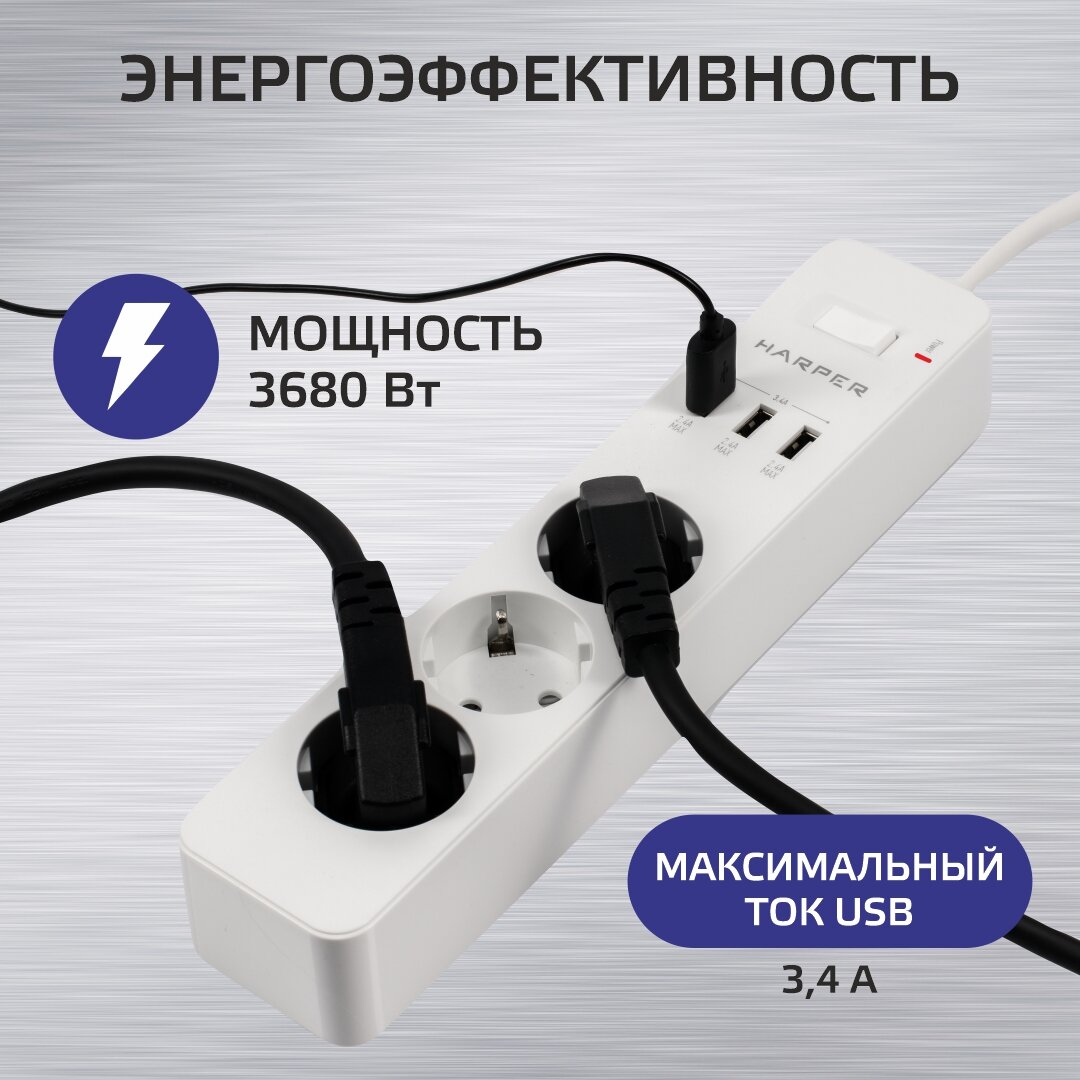 Сетевой фильтр HARPER UCH-325 White 3р/3м/3680W/16A/3xUSB/220-240V/50Hz 3 950 ₽