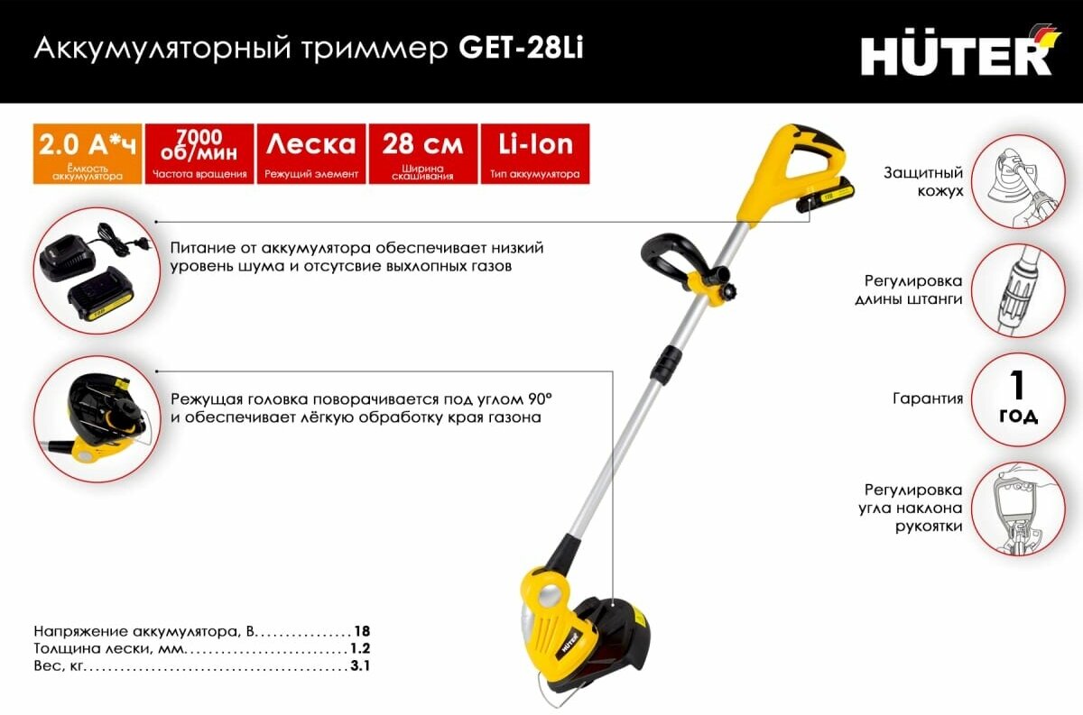 Аккумуляторный триммер / электротриммер GET-28Li Huter (20 В, 2 Ач, Li-ion, 7000 об/мин, скашивание леской - 28 cм, Ø – 1.2 мм)