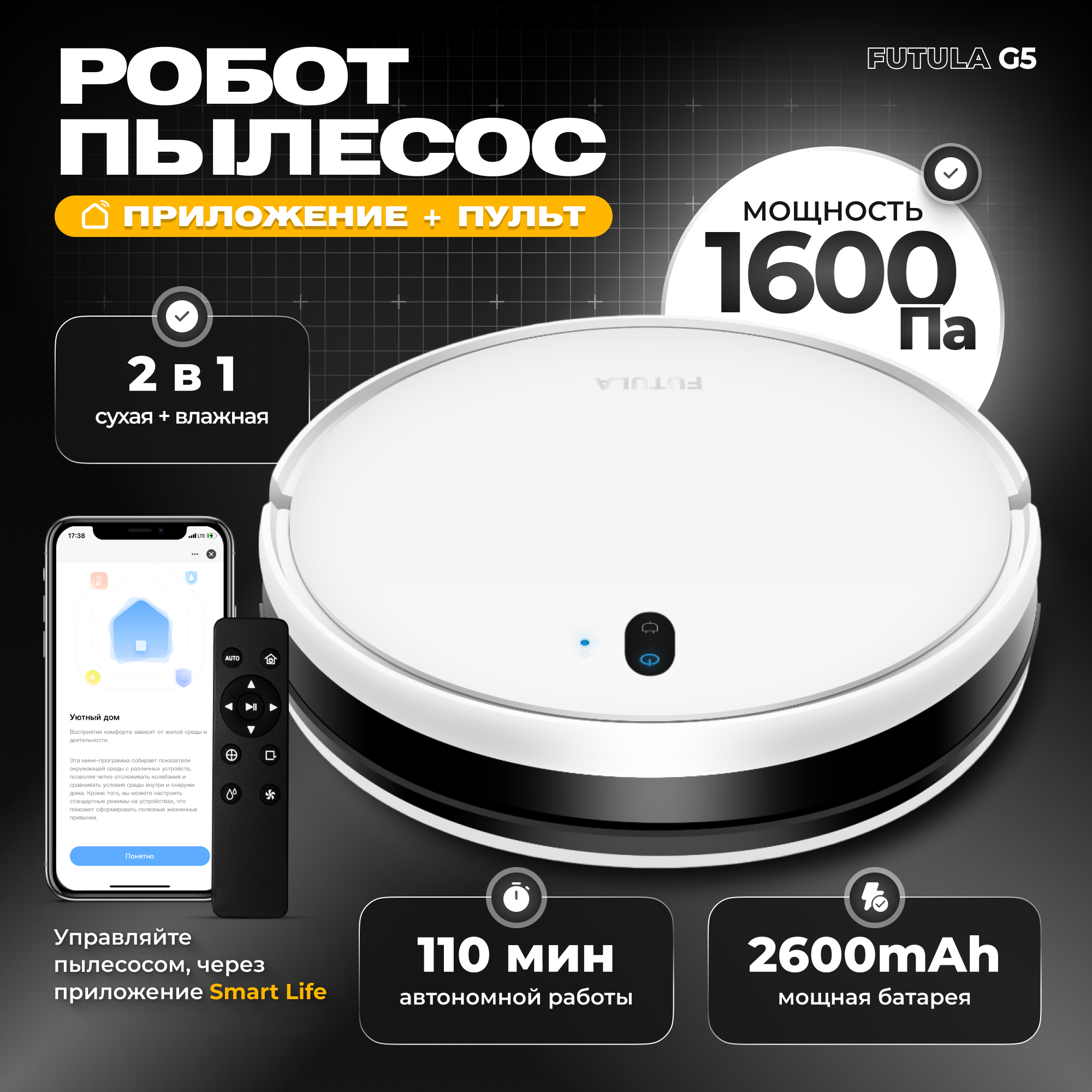Робот-пылесос Futula Robot Vacuum Cleaner and Mop G5 черный, сухая/влажная уборка, управление через смартфон 15 737 ₽