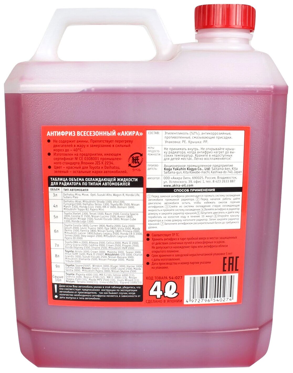 Антифриз всесезонный AKIRA COOLANT -40°C (красный), (4л) информация: