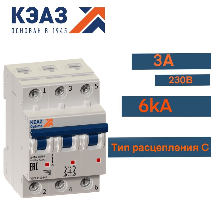 Выключатель автоматический 3А 3П трехполюсный характеристика C 6kA BM63 OptiDin 260797 КЭАЗ информация: