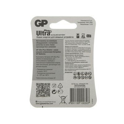 Батарейка алкалиновая GP Ultra Plus, AAA, LR03-2BL, 1.5В, блистер, 2 шт. информация: