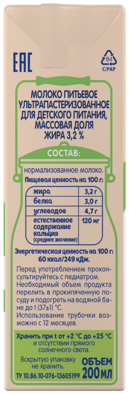 Молоко тема ультрапастеризованное 3,2%, 200 мл информация: