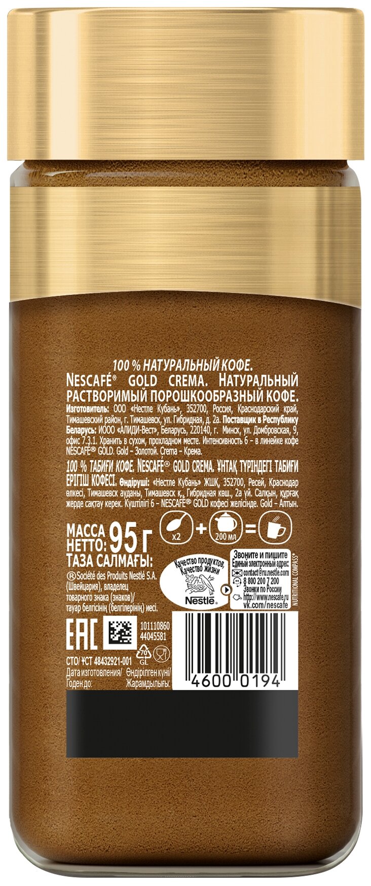 Кофе Nescafe Gold Crema, растворимый, 95 г./В упаковке шт: 2