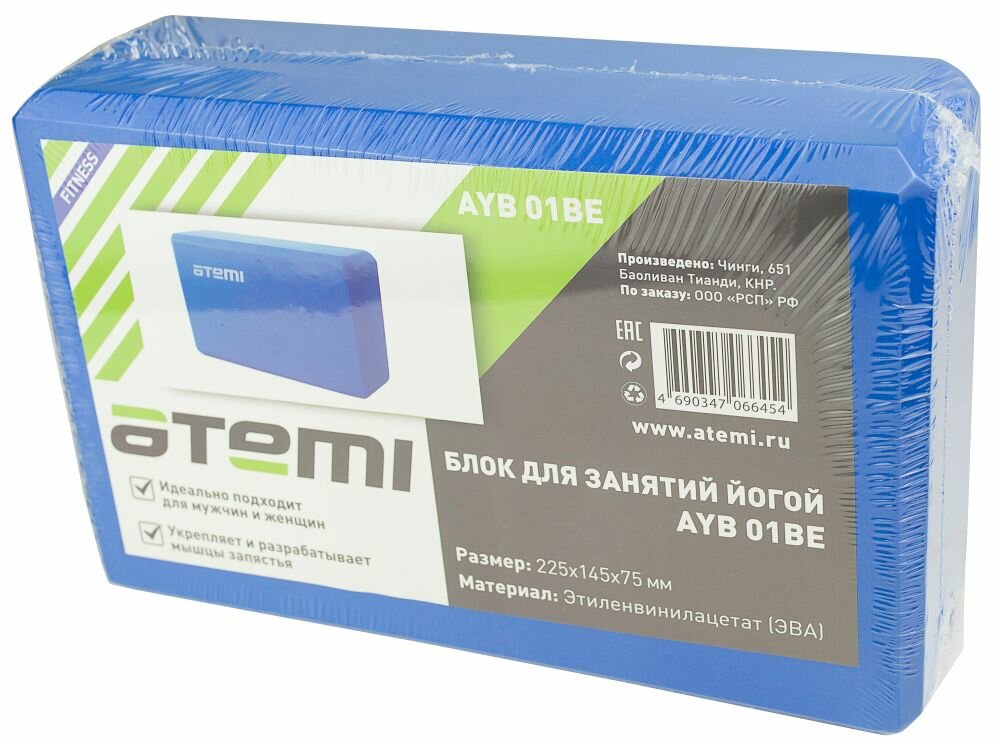 Блок для йоги Atemi, AYB01BE, 225х145х75, голубой информация:
