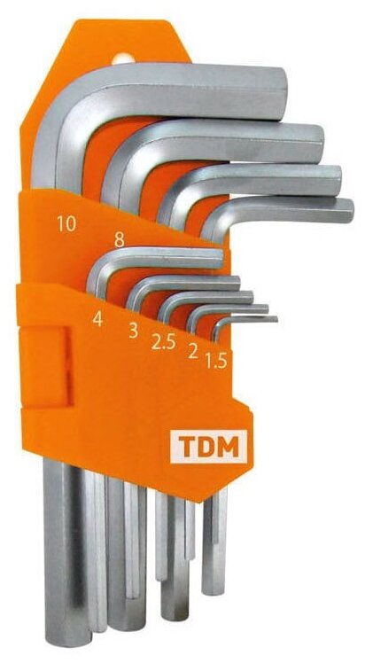 Набор ключей имбусовых TDM HEX (шестигранники), 9 штук 1.5-10мм, короткие, (держатель в блистере), CR-V сталь "Алмаз"