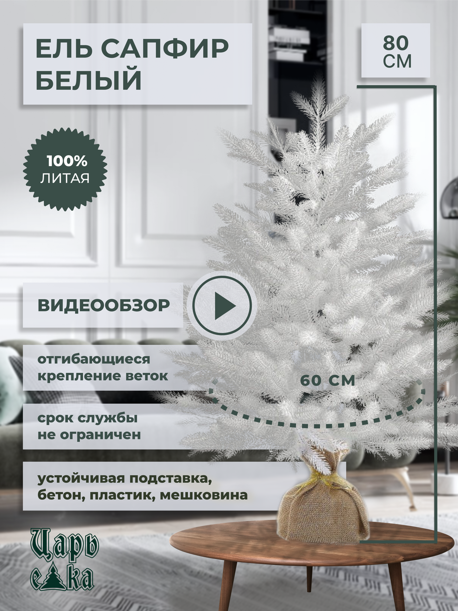 Настольная белая елка в мешочке Сапфир 80 см, литая 100%, царь елка СФ/Б-80