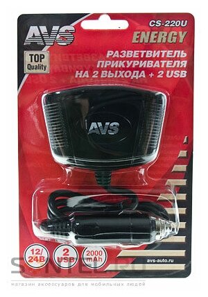 Разветвитель розетки для прикуривателя avs на 2 выхода +2 usb cs220u