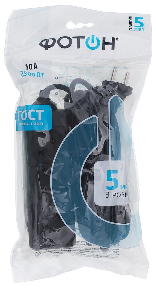 Фотон Удлинитель сетевой 10-53, 5м, 3 розетки, 10А, Черный 22720 .