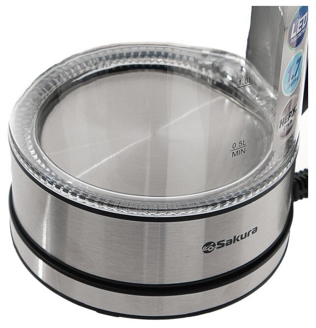 SAKURA Чайник электрический Sakura SA-2720SBK, стекло, 1.7 л, 2200 Вт, серебристый