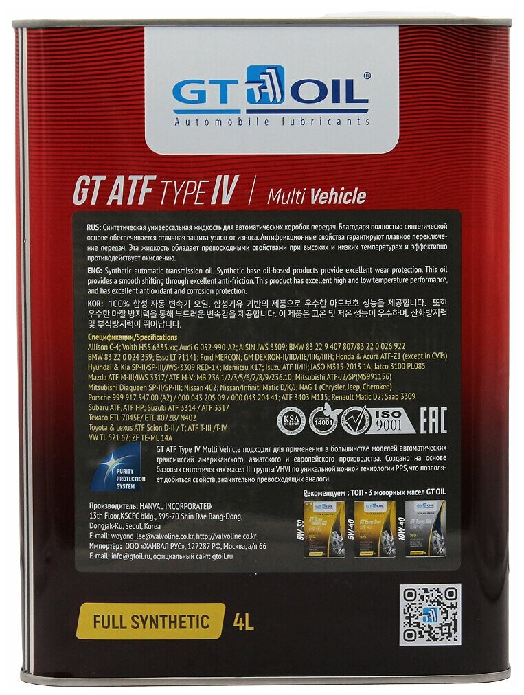 GT OIL 8809059407912 Масло GT ATF T-IV Multi Vehicle 4 л 8 820 ₽