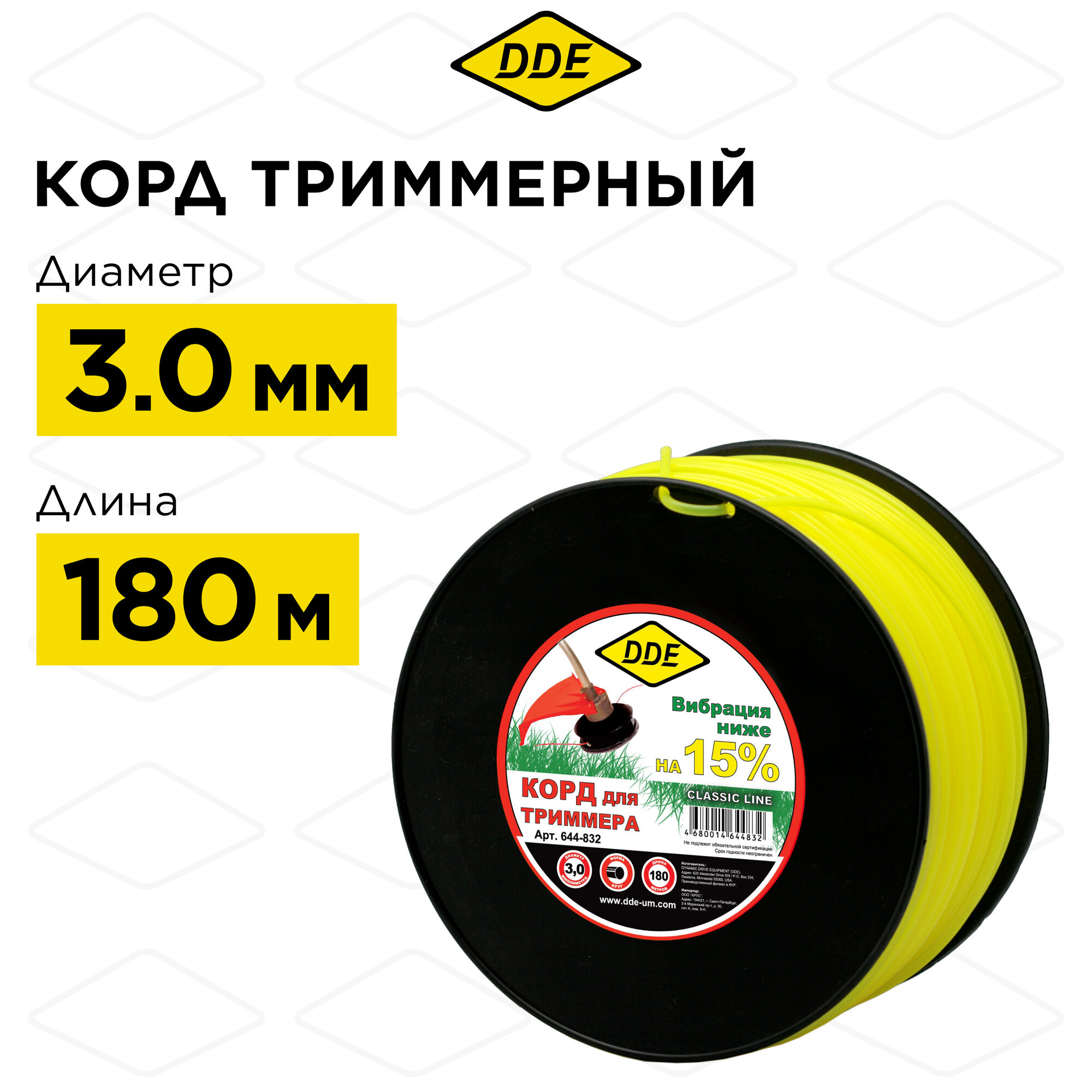 Корд триммерный на катушке DDE "Classic line" (круг) 3,0 мм х 180 м, желтый