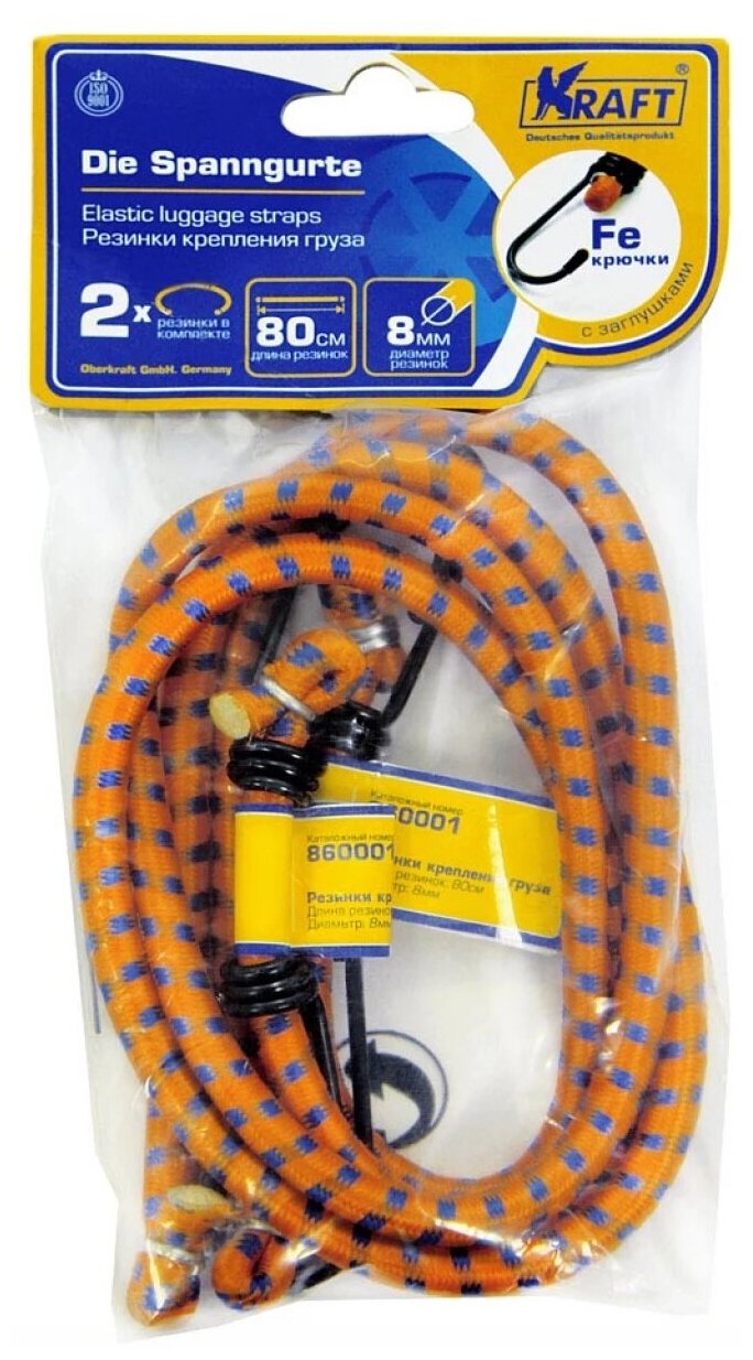 KRAFT KT860001 Набор резинок в багажник (80 см) "KRAFT" (D=8 мм, метал. крючки) (2 шт.)