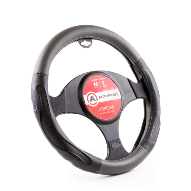 Оплетка руля AUTOPROFI AP-1946 BK/D.GY (M) с увеличенным обхватом 9 см., композитная экокожа с вставками под хват. чёрн./т.серый, разм. М,