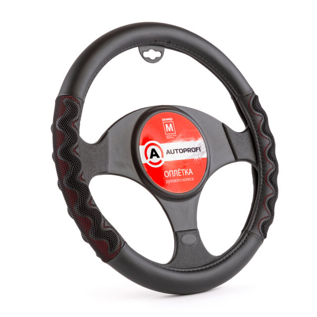 Оплётка руля "AUTOPROFI", экокожа, объемные вставки, (черный/красный) (М)