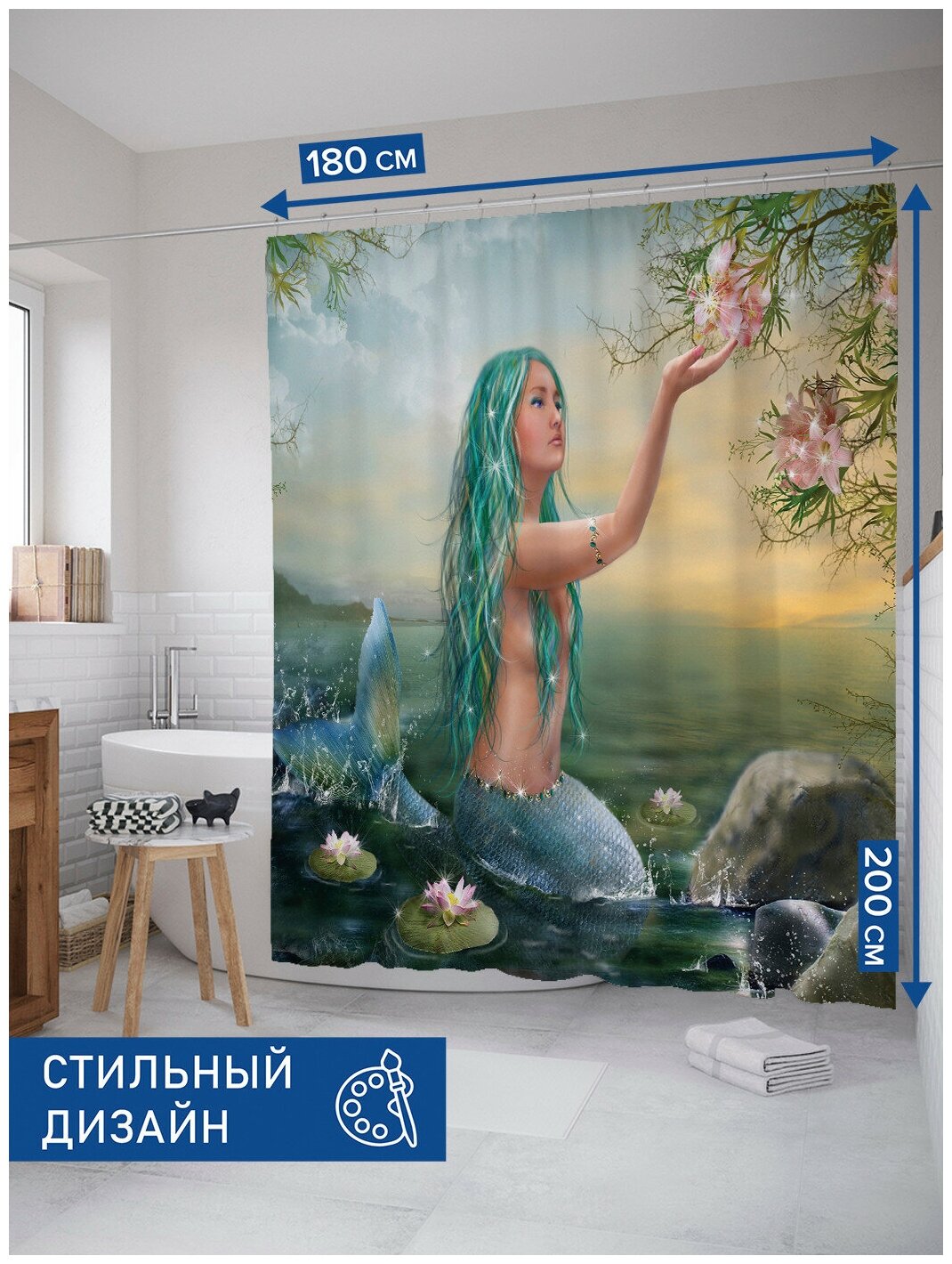 Отзывы на Штора для ванной, занавеска в ванную комнату JoyArty "Очаровательная русалка" из сатена, 180х200 см с крючками