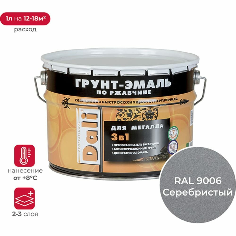 Грунт - эмаль, краска по ржавчине гладкая 3 в 1 DALI / Дали по металлу серебристый алюминий, RAL 9006 0,75 л 1 100 ₽