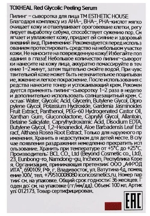 10 цен на Esthetic House Пилинг-сыворотка гликолевая - Toxheal red glyucolic peeling serum, 100мл