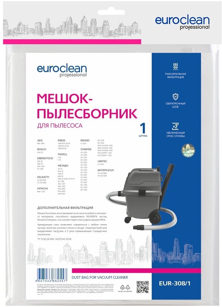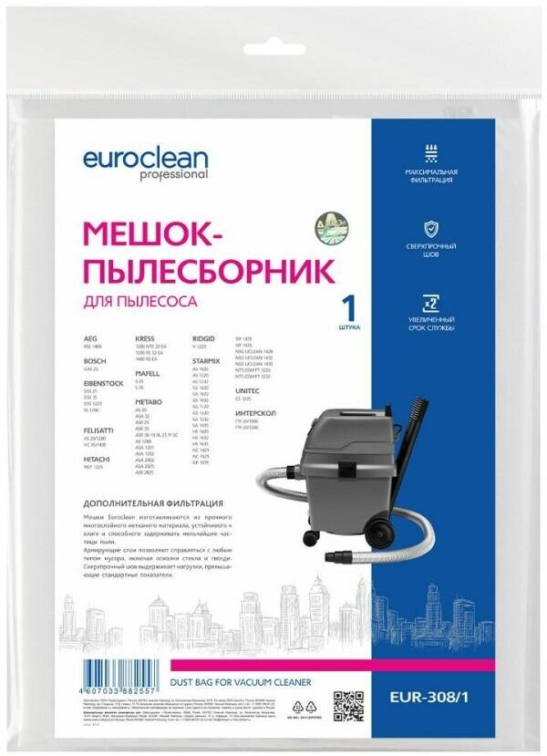 Euroclean EUR-308/1 Мешок для пылесоса BOSCH GAS 25 KRESS 1400 ИНТЕРСКОЛ ПУ-32/1200 STARMIX FB20/25/35 AEG FELISATTI HITACHI METABO 1 шт. синтетические / пылесборник