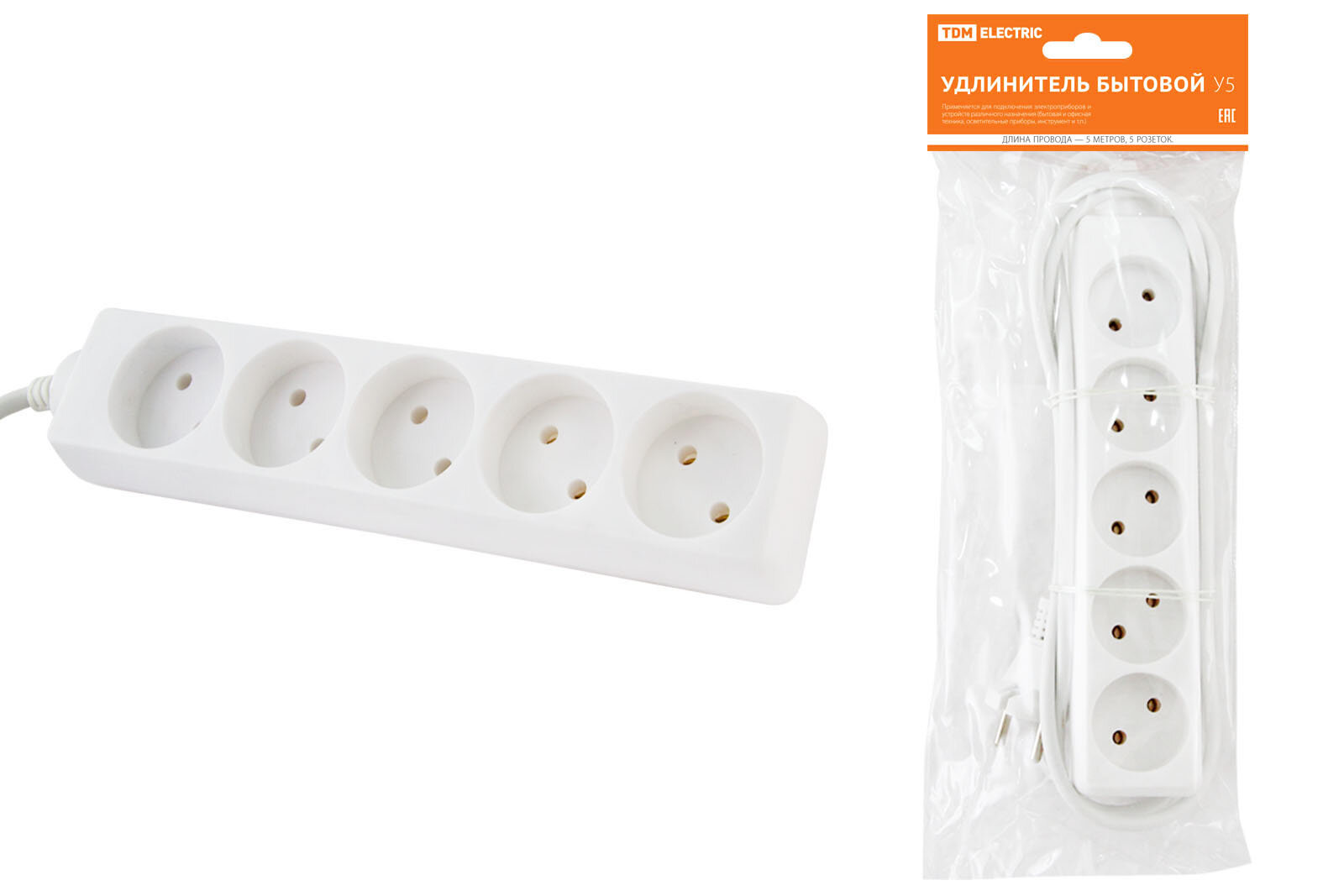 TDM Удлинитель бытовой У5 5 гнезд, 5метров, без заземления, ПВС 2х0,75мм2 10А/250В SQ1303-0222 (20 шт.) 18 160 ₽
