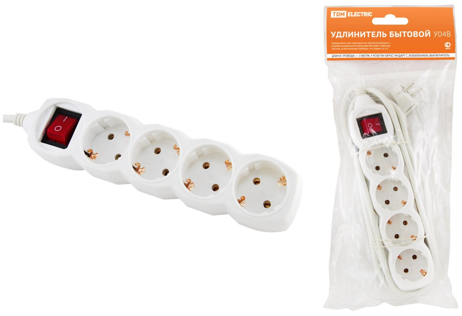 Удлинитель бытовой TDM У04В, 4 гнезда, с заземлением и выключателем, ПВС 3x1, 3м