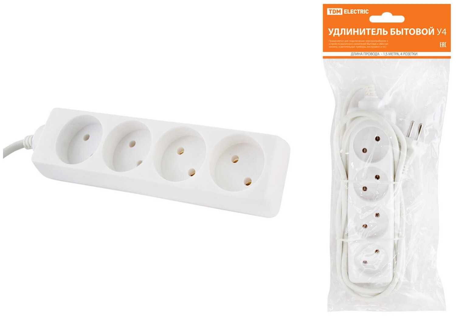 Отзывы на Удлинитель бытовой TDM У4 4 гнезда 1,5 метра ПВС 2/0,75мм2 белый 10А 250В без заземления