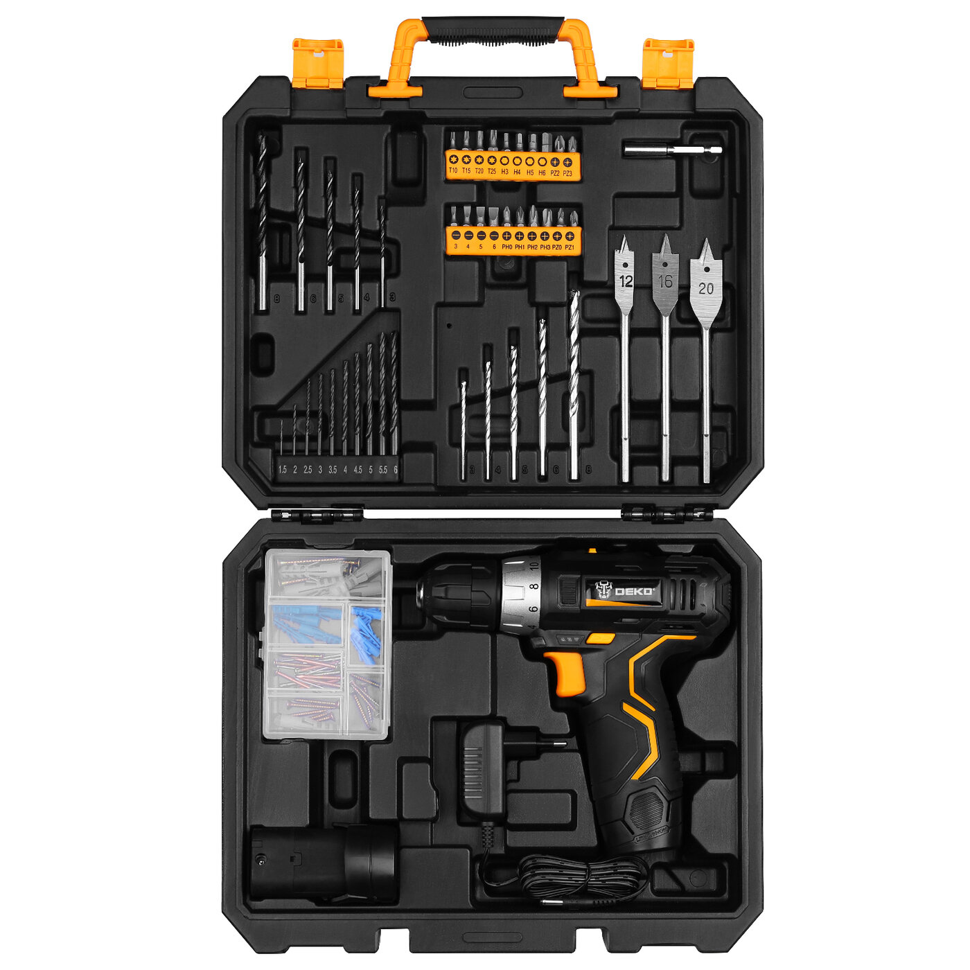 Дрель-шуруповерт аккумуляторная DEKO GCD12DU3 2*12В 1.5Ач Li-Ion, набор инструментов 92 предмета