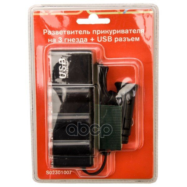 Разветвитель прикуривателя 3 гнезда + USB SKYWAY Черный, предохранитель 5А, USB 1A S02301007