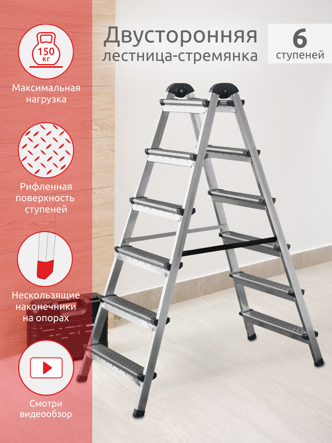 Отзывы на Лестница-стремянка двухсторонняя алюминиевая, нагрузка до 120 кг, высота площадки 123 см, 111406