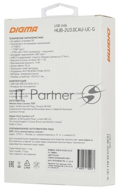 Разветвитель USB-C Digma HUB-2U3.0СH-UC-G 4порт. серый информация: