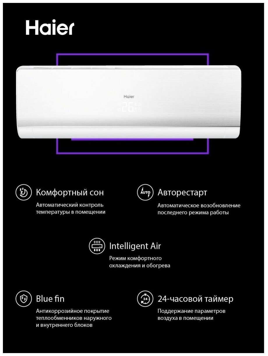 Новая инверторная сплит-система Haier QUANTUM Inverter AS25HQJ1HRA-B/1U25HQJ1FRA, для помещений 25 кв. м, черного цвета