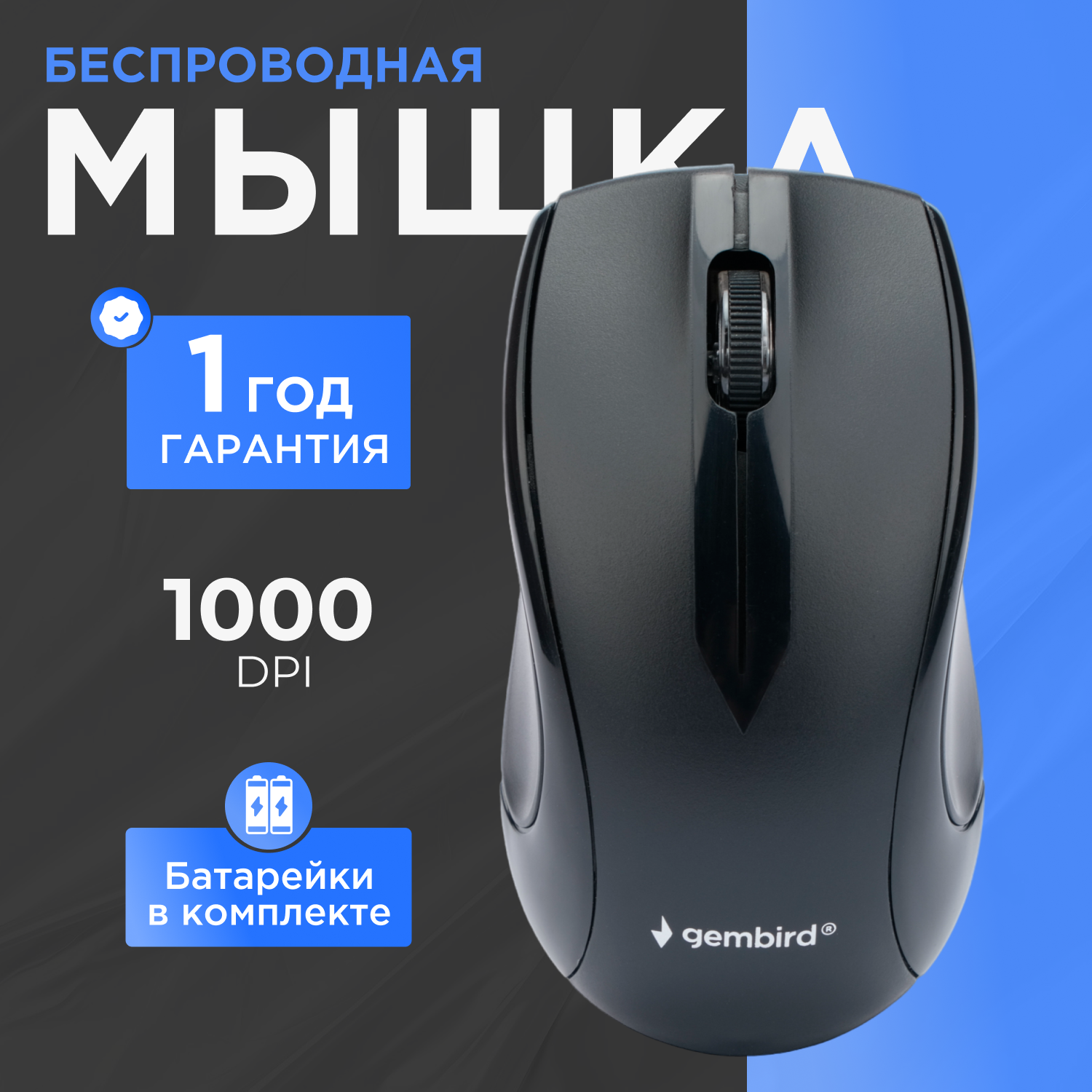 Мышь беспроводная Gembird MUSW-320, 2.4 ГГц, черный, 2 кнопоки+колесо-кнопка, 1000 DPI, батарейки в комплекте