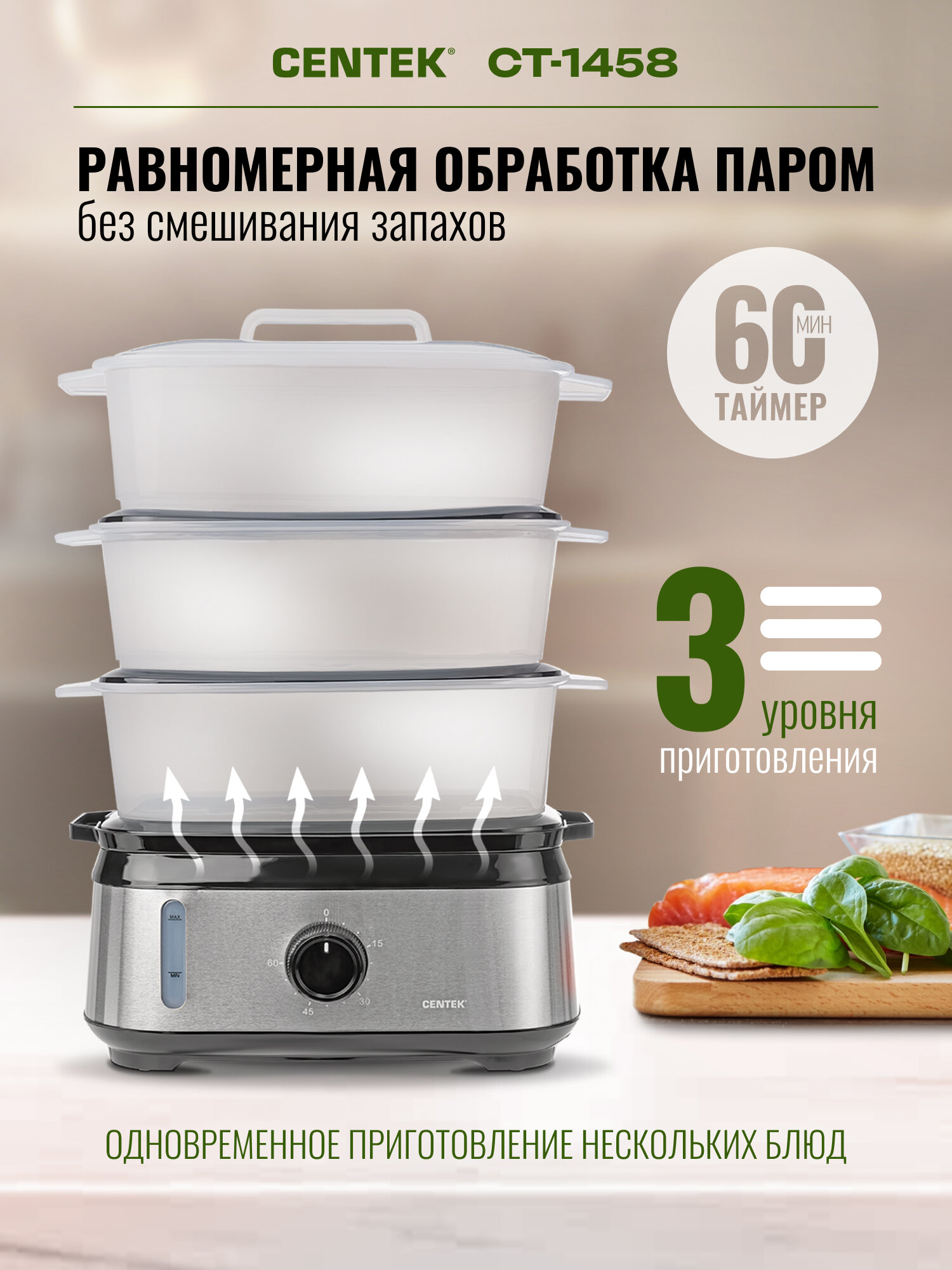 Пароварка CENTEK CT-1458, 9л 1050Вт, стальной корпус, таймер 60 мин, 3 контейнера, чаша для риса