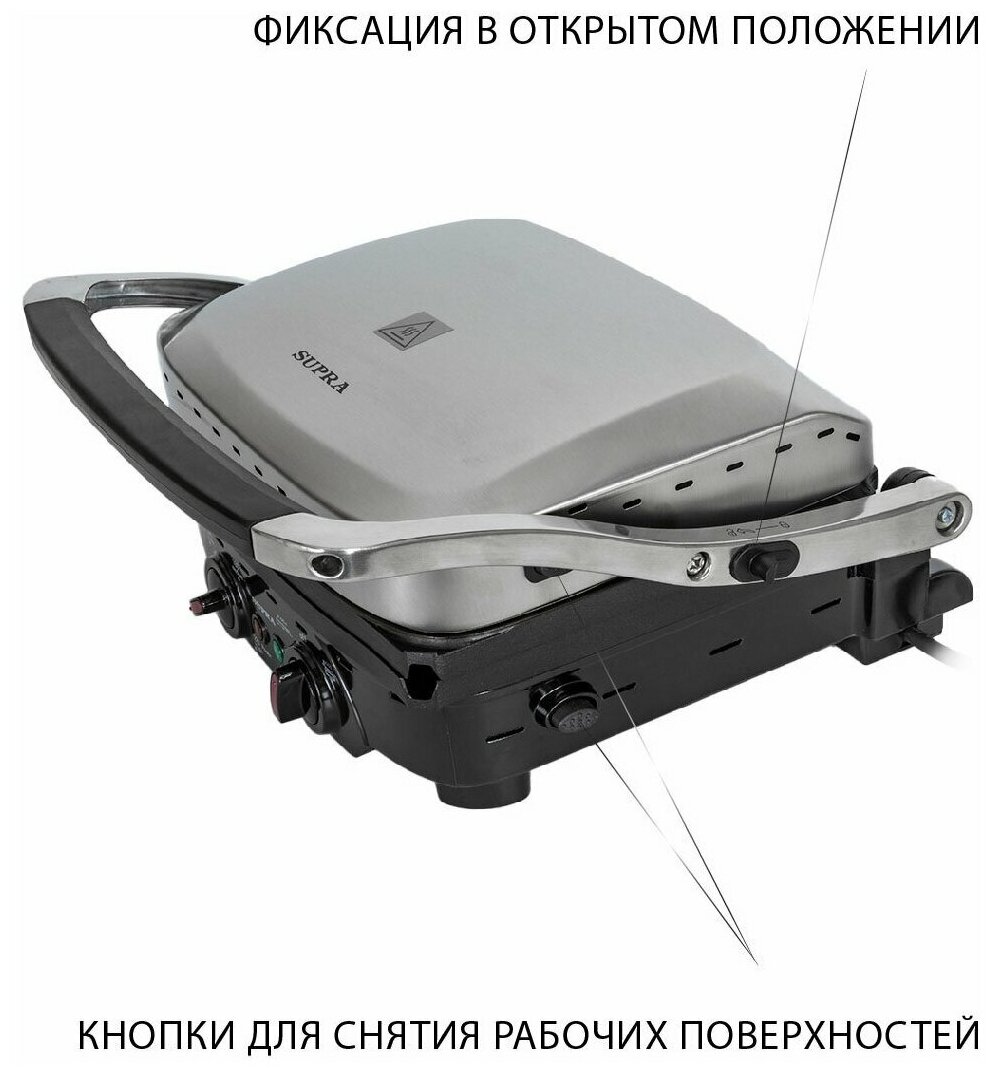 Электрогриль для дома Supra со съемными панелями с многослойной антипригарной системой защитного покрытия MLS, режимы гриль-пресс + барбекю 180 градусов, регулировка температуры, 2000 Вт информация: