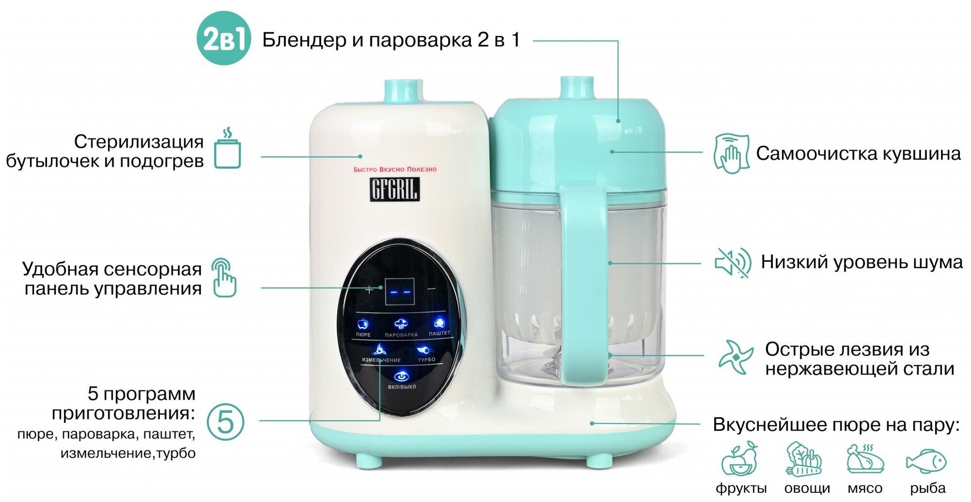 Отзывы на GFGRIL Пароварка-блендер GFSB-6, 5 программ, дисплей, таймер, подогрев бутылочек, стерилизация, пароварка блендер для детского питания