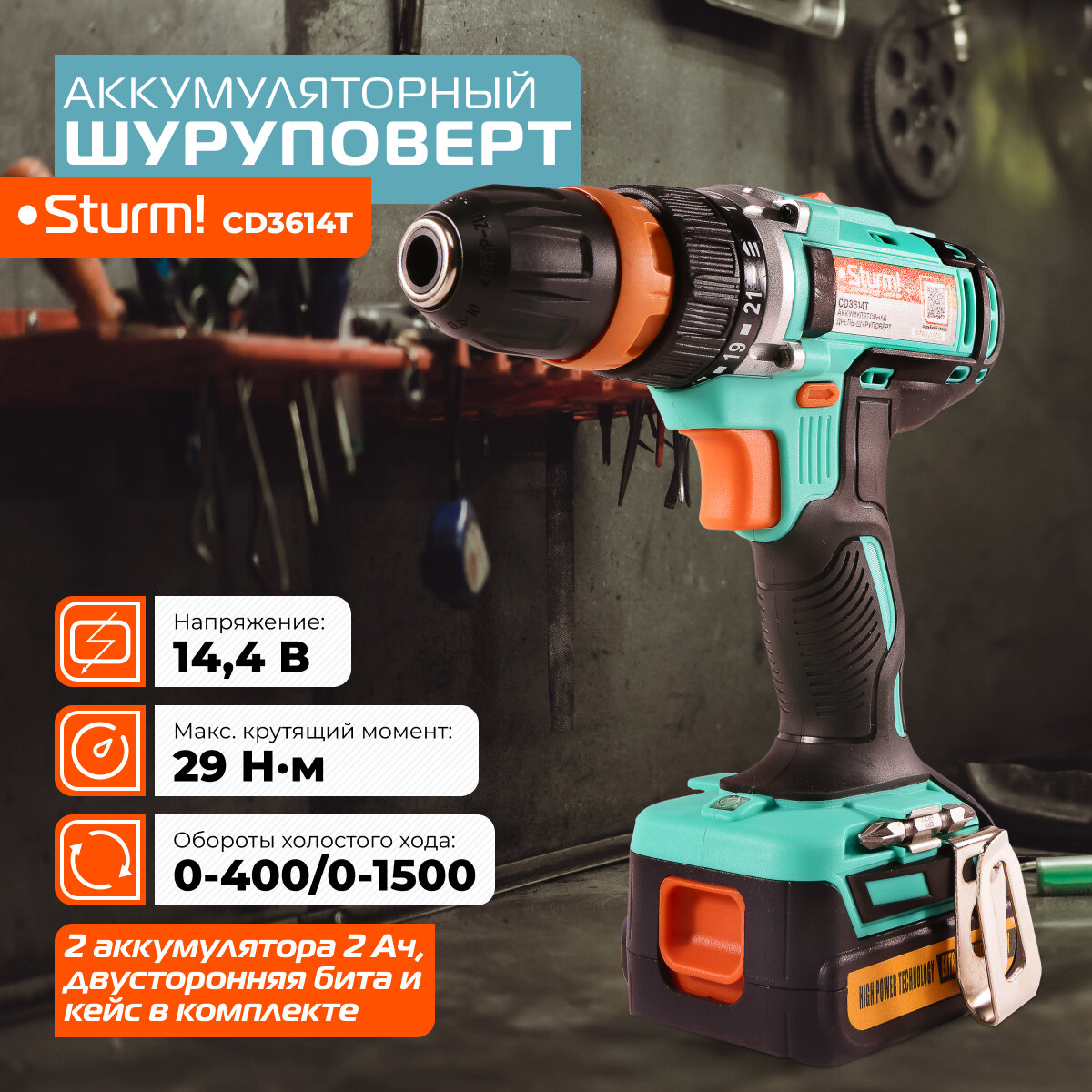 Sturm! Дрель, Шуруповерт CD3614T Дрель аккумуляторная 14 В, 2 акк. 2,0 Ач, съемный патрон, кейс CD3614T