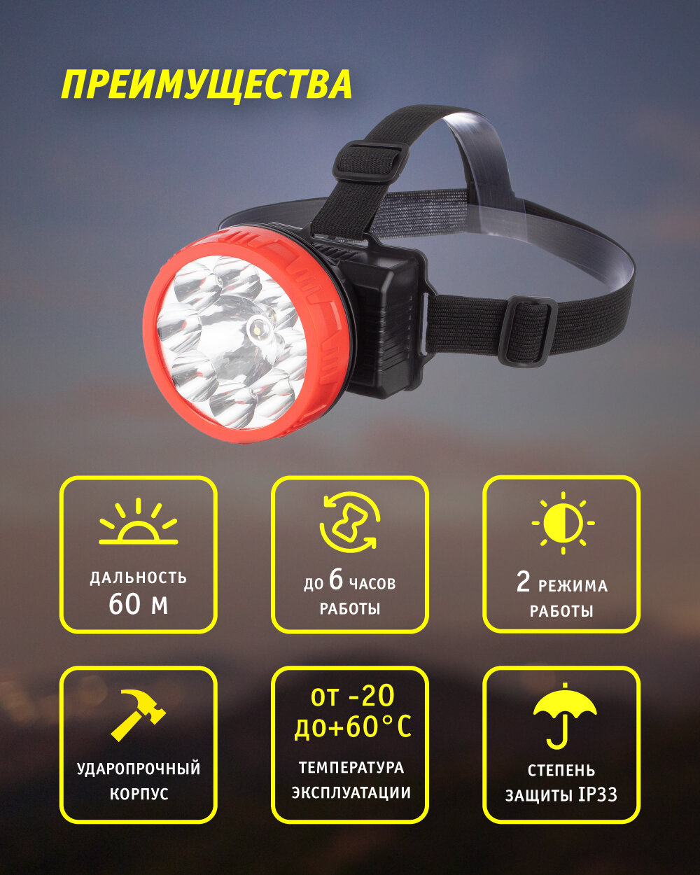 Фонарь налобный Navigator NPT светодиодный 9 LED 1 Вт аккумуляторный Lead-acid 900 мАч ударопрочный пластик 2 режима (14448) 980 ₽