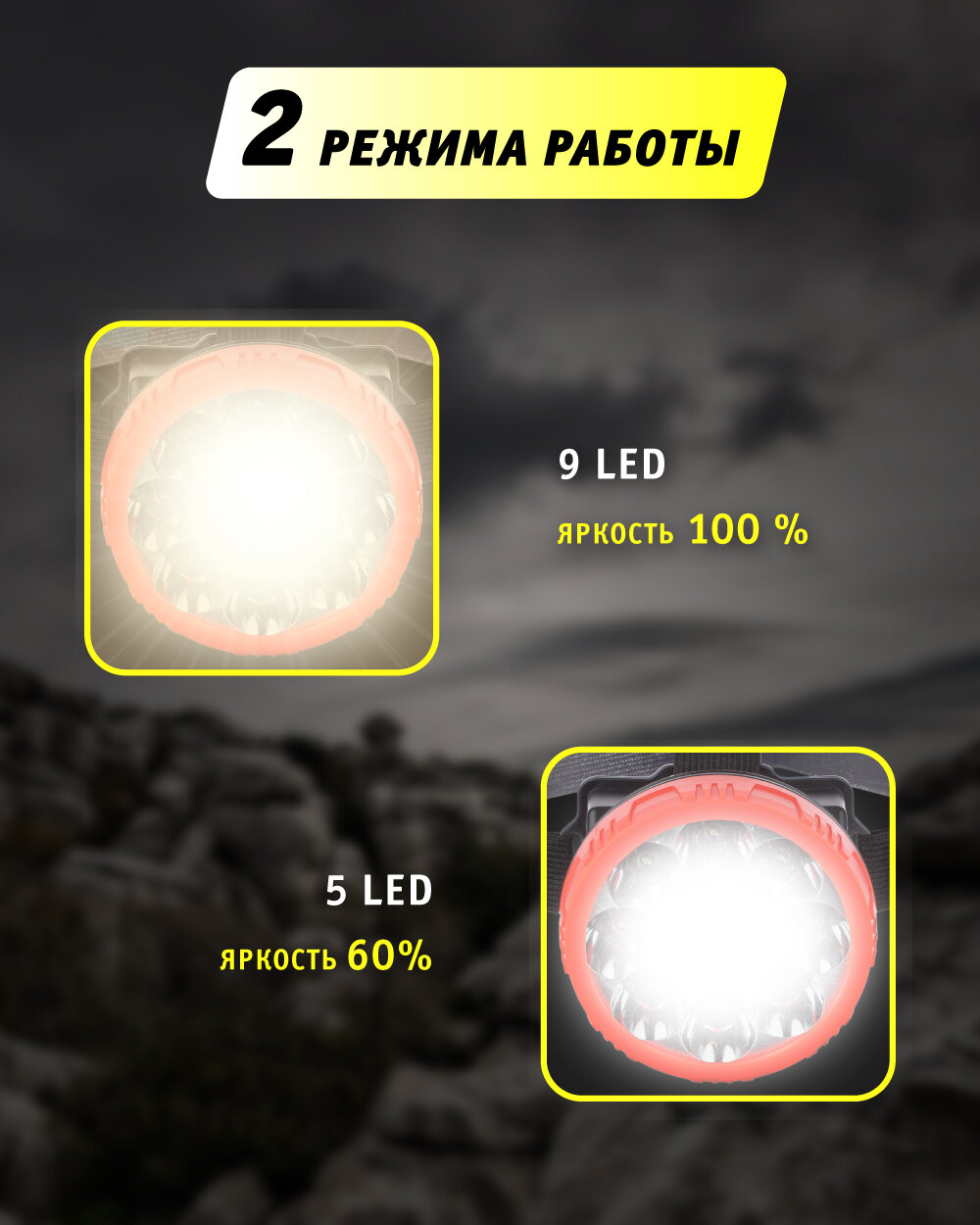 (2 шт.) Фонарь налобный Navigator NPT-H21-ACCU 9LED 1Вт,2 режима Li-ion 0,9Ач 14 448