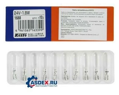 10 цен на Автолампа Koito 1688 W1,8w(T5) 24v 1,80w W2x4,6d (К10/100) KOITO арт. 1688