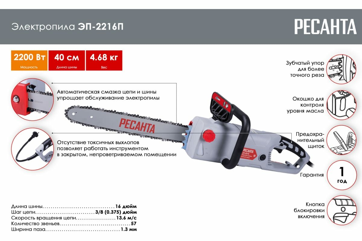 Цепная пила РЕСАНТА ЭП-2216П [70/10/13] информация: