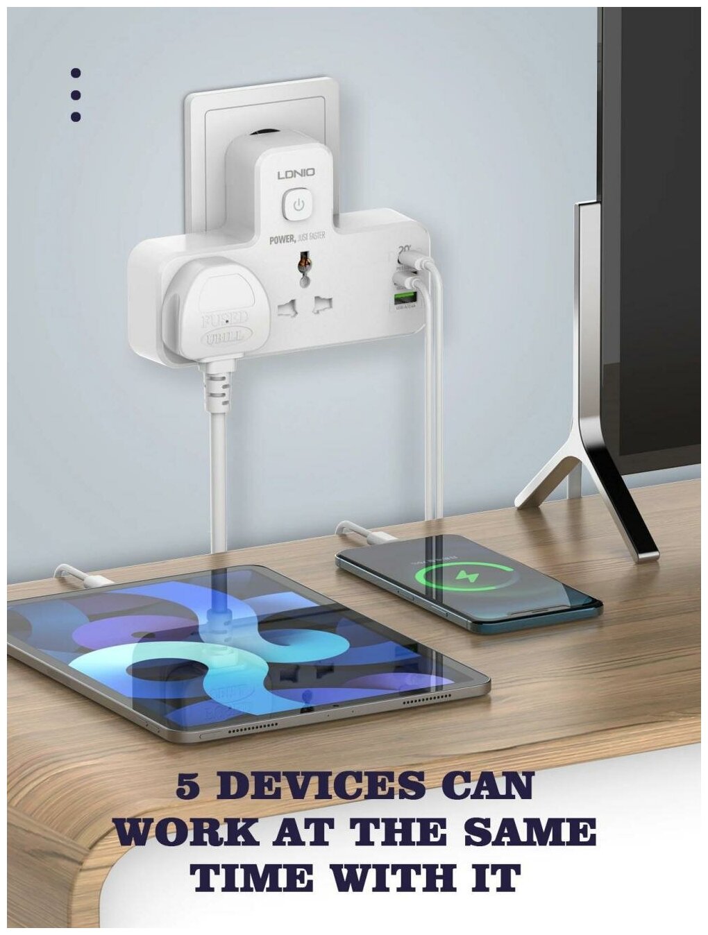 Сетевой фильтр LDNIO SC2337 без провода - 2 универсальные розетки + USB зарядка 3 порта PD + QC3.0 - белый