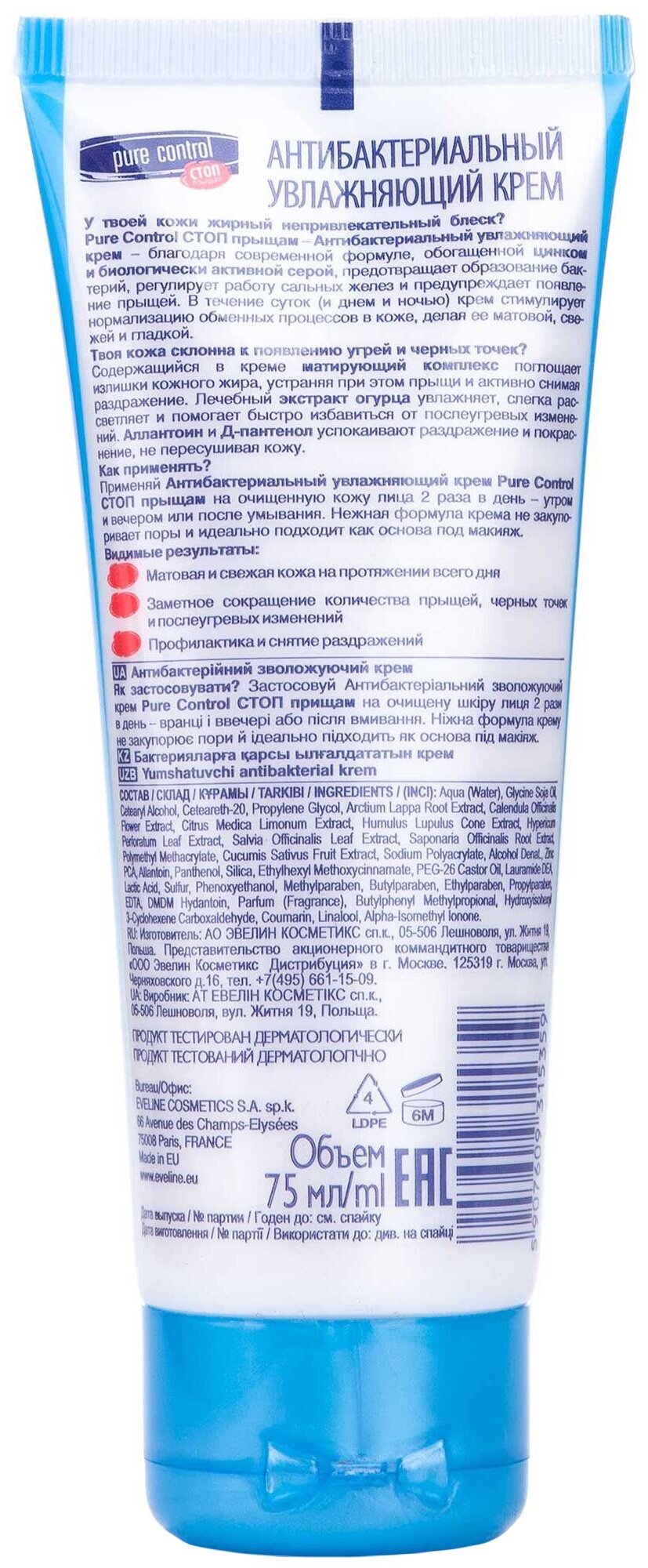 10 цен на Крем EVELINE «PURE CONTROL», антибактериальный, увлажняющий, против прыщей и послеугревых изменений, 75мл