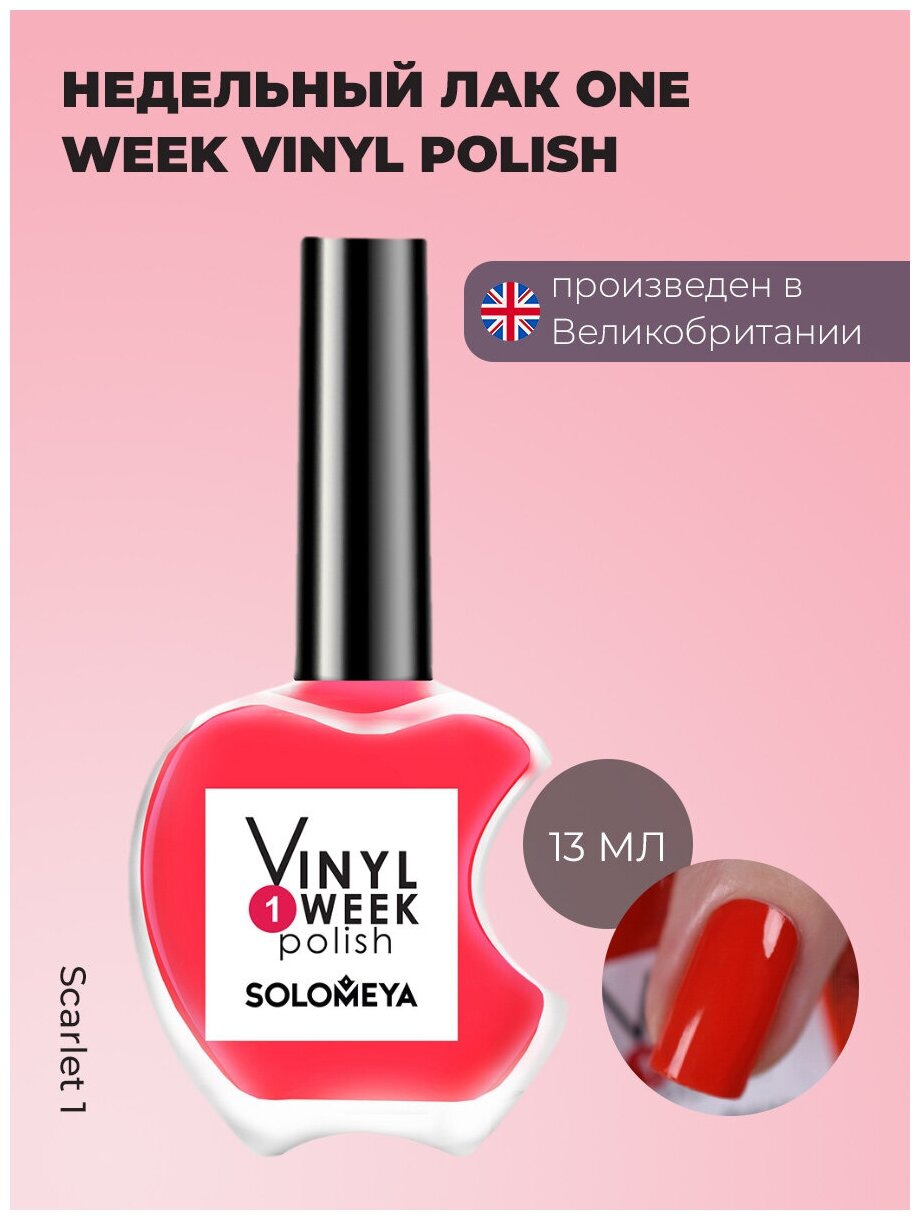 Лак для ногтей стойкий Solomeya, недельный лак для ногтей, глянцевый цвет Скарлет (Алый), One Week Vinyl Polish Scarlet 1, 13 мл информация: