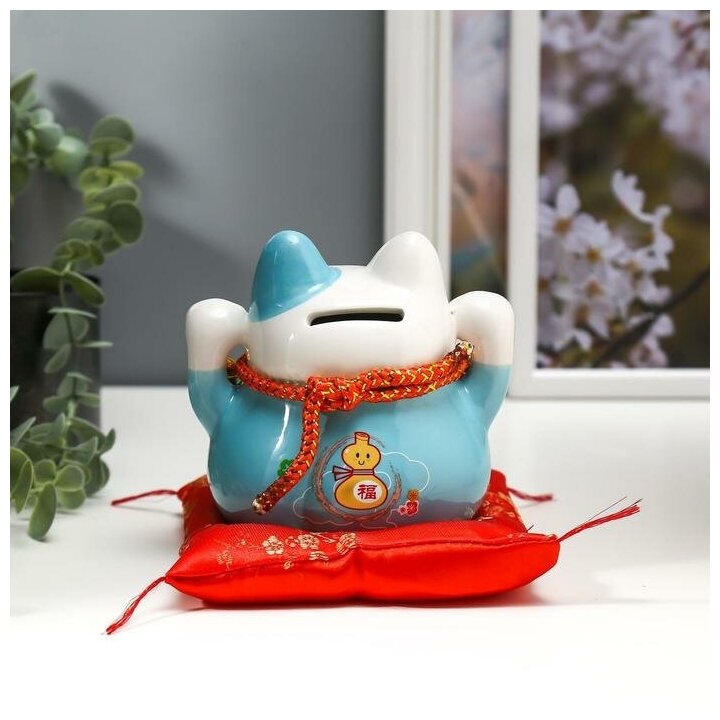 Копилка "Голубой кот Манэки-нэко с колокольчиками" 11,5х11,5х9,5 см