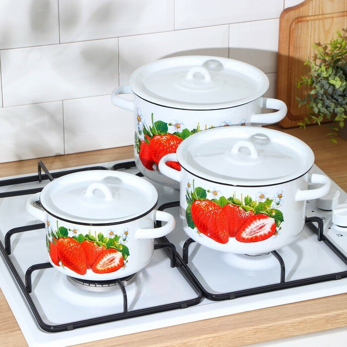 10 цен на Стальэмаль Набор кастрюль «Клубника садовая», 3 предмета: 1,5 л, 2,9 л, 4,5 л, цвет белый