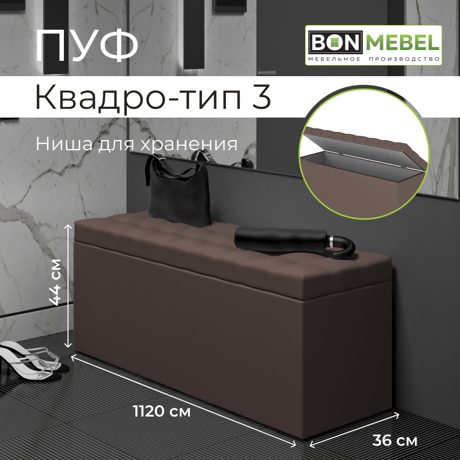 Пуфик БонМебель Квадро 3, коричневый, 112х36х44, пуф с ящиком для хранения, экокожа, пуфик в прихожую, мебель