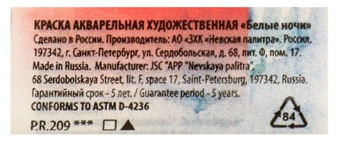 Завод художественных красок «Невская палитра» Акварель художественная в кювете 2.5 мм, ЗХК "Белые ночи", алый хинакрид информация: