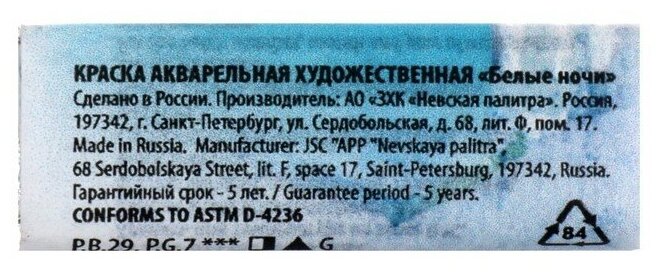 Акварель художественная кювета 2,5мл ЗХК "Белые ночи" Голубая 1911513 3245002 информация: